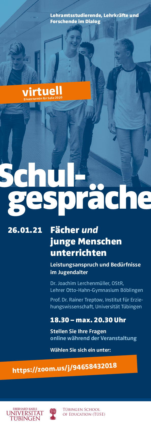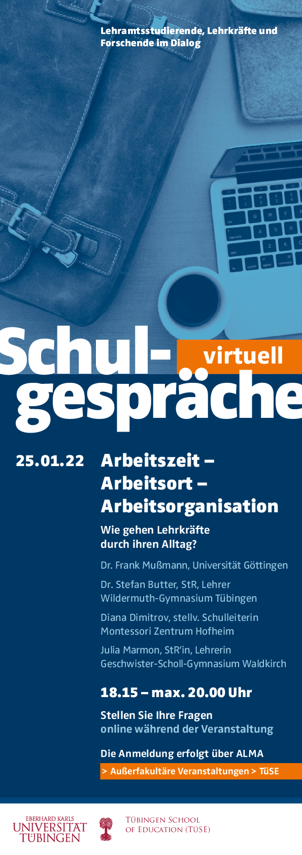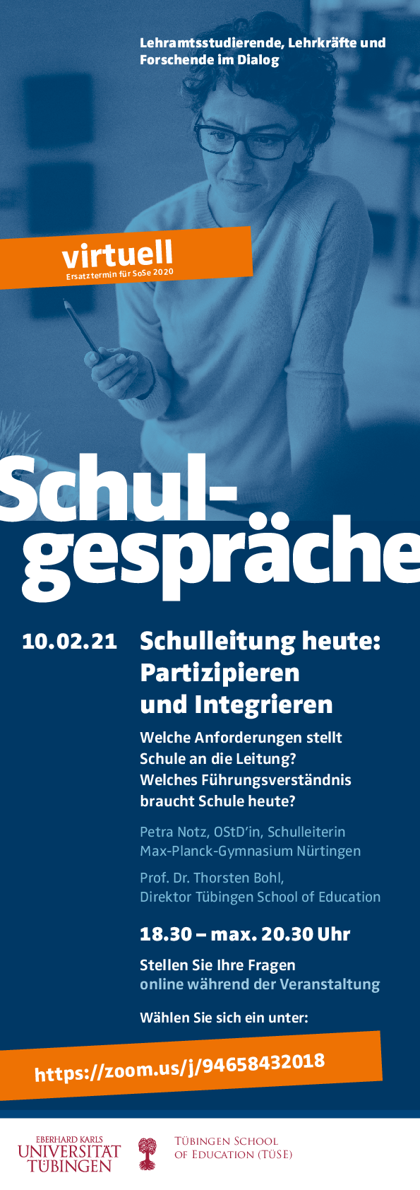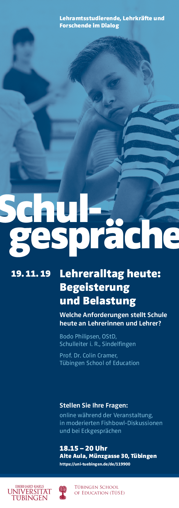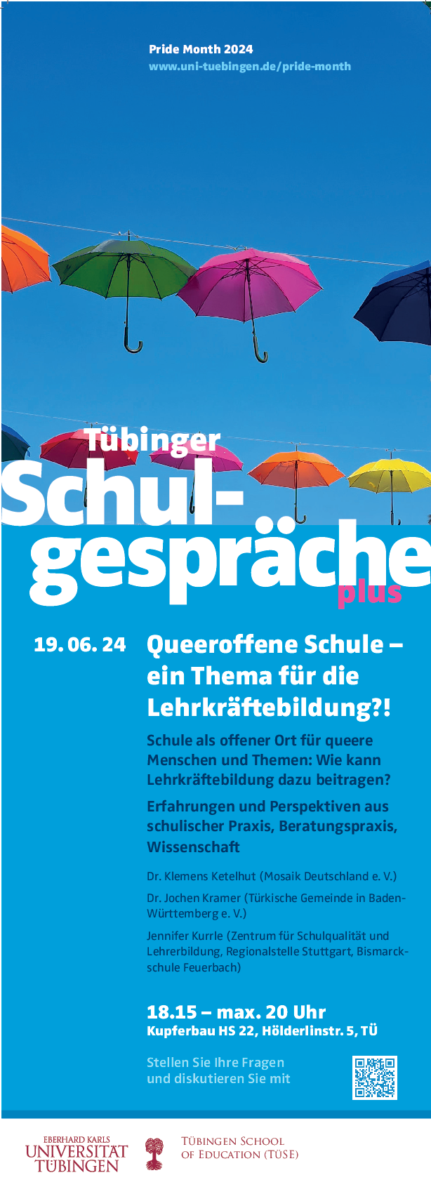 In Ergänzung zur Reihe Tübinger Schulgespräche thematisiert die Reihe Tübinger Schulgespräche plus besondere aktuelle gesellschaftliche Herausforderungen in der Schule und Lehrkräftebildung. Die verschiedenen Fragestellungen werden aus unterschiedlichen Perspektiven beleuchtet (schulischer Praxis, Wissenschaft, Beratungspraxis und/oder außerschulischer Bildung) und gemeinsam mit dem Publikum diskutiert. Unser Anliegen ist es, einen mehrperspektivischen Austausch auf Augenhöhe anzuregen und zu fördern.