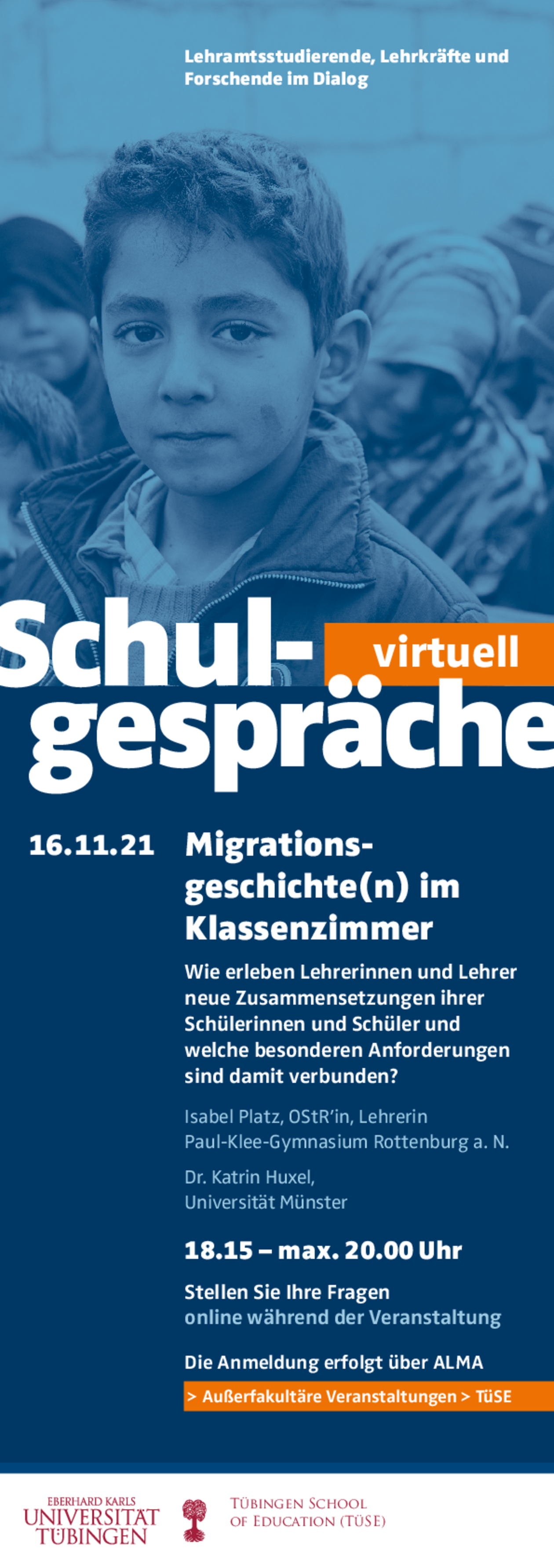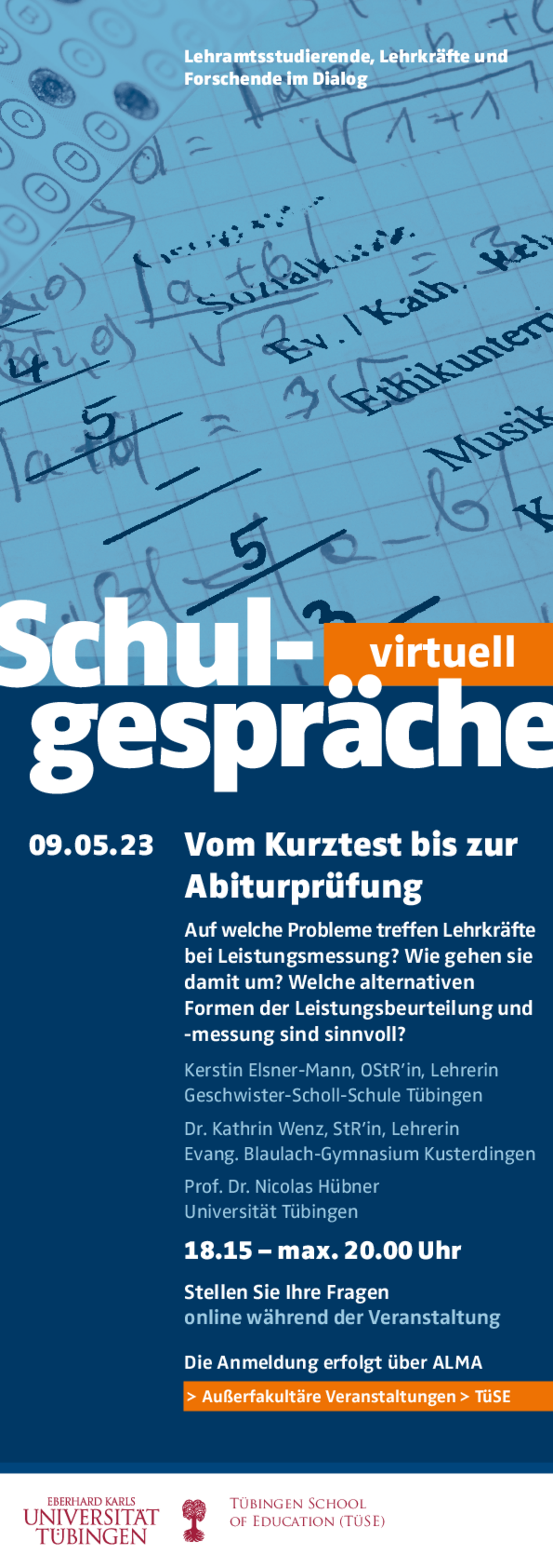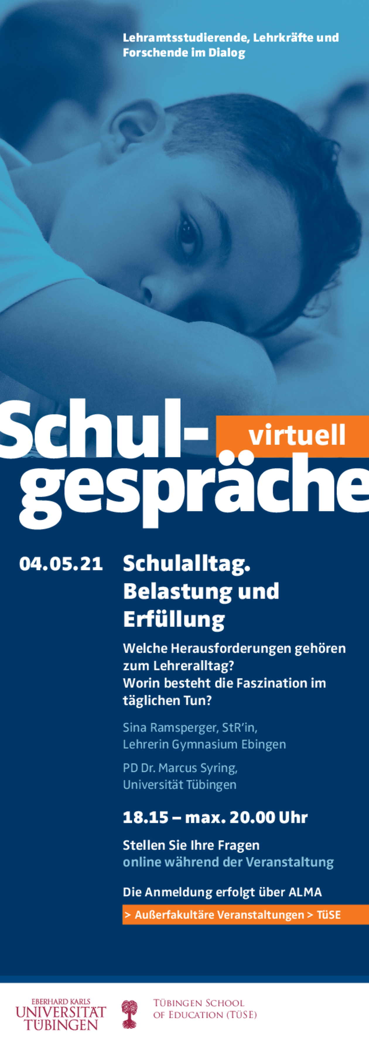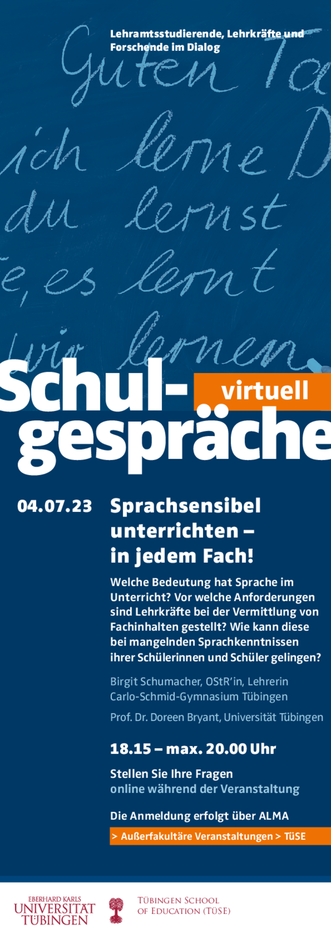 In Ergänzung zur Reihe Tübinger Schulgespräche thematisiert die Reihe Tübinger Schulgespräche plus besondere aktuelle gesellschaftliche Herausforderungen in der Schule und Lehrkräftebildung. Die verschiedenen Fragestellungen werden aus unterschiedlichen Perspektiven beleuchtet (schulischer Praxis, Wissenschaft, Beratungspraxis und/oder außerschulischer Bildung) und gemeinsam mit dem Publikum diskutiert. Unser Anliegen ist es, einen mehrperspektivischen Austausch auf Augenhöhe anzuregen und zu fördern.