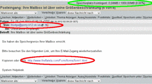 This phishing email tries to lure unsuspecting users with a link to a form in which you are supposed to enter your access data. In the webmailer you can easily see the quota status (circled in green).