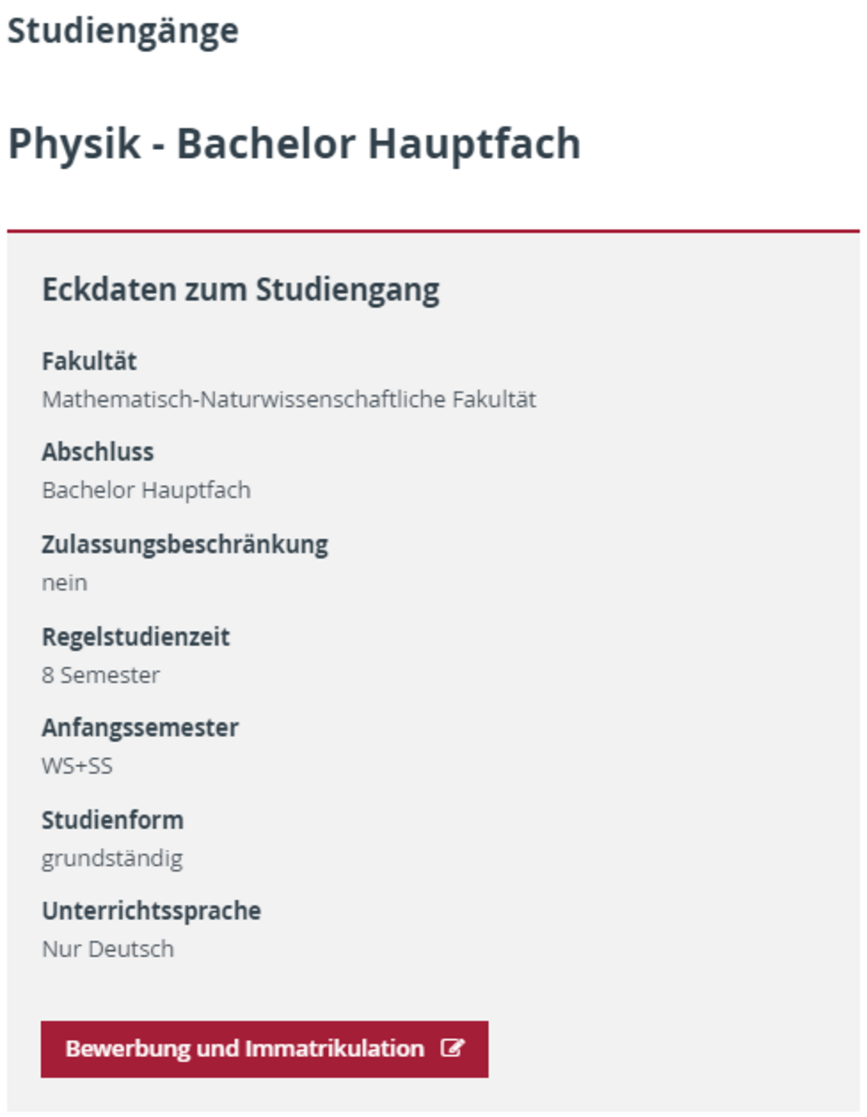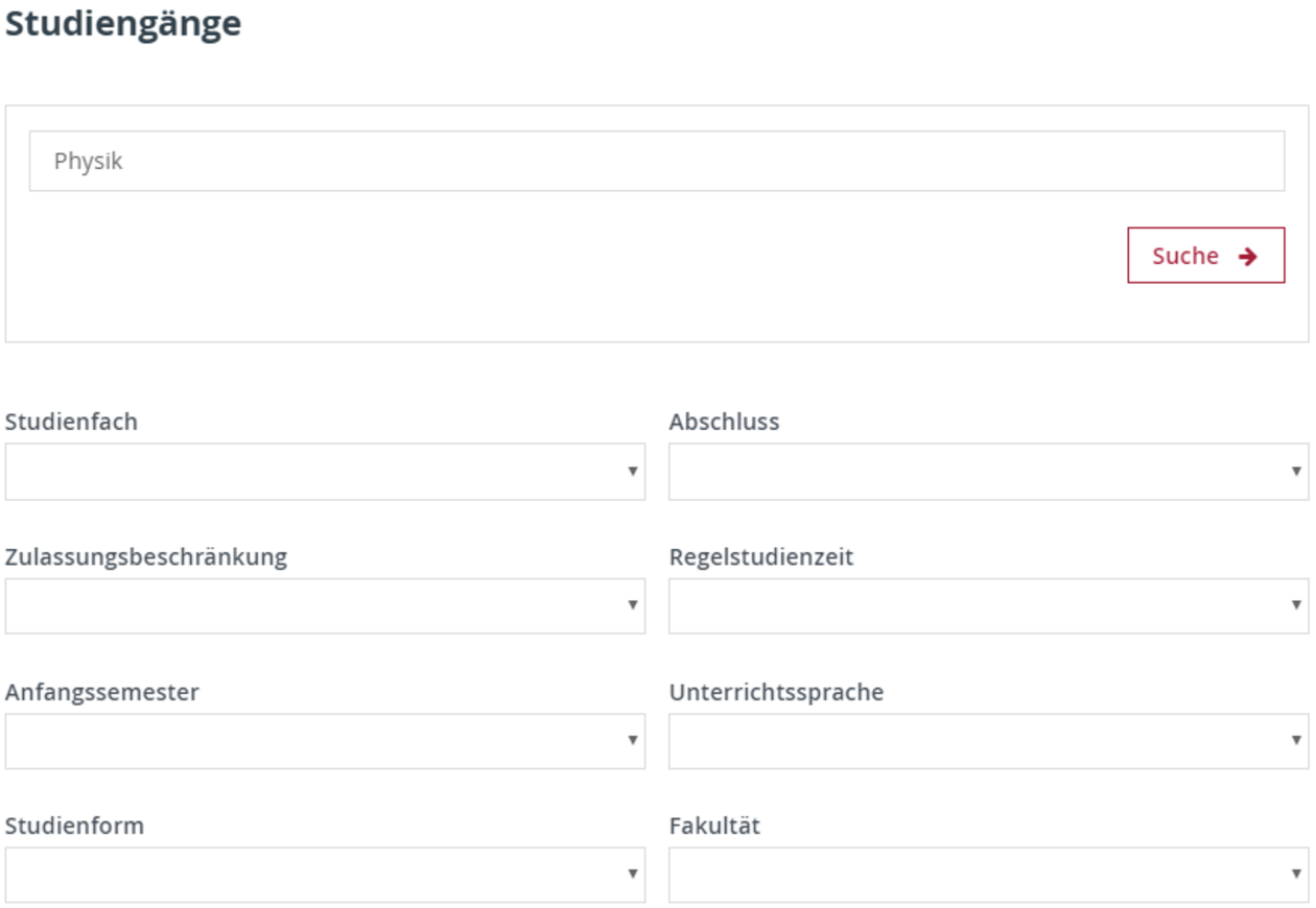 1. Wählen Sie im Verzeichnis der Studiengänge das gewünschte Studienfach aus und klicken Sie es an, beispielsweise Physik: