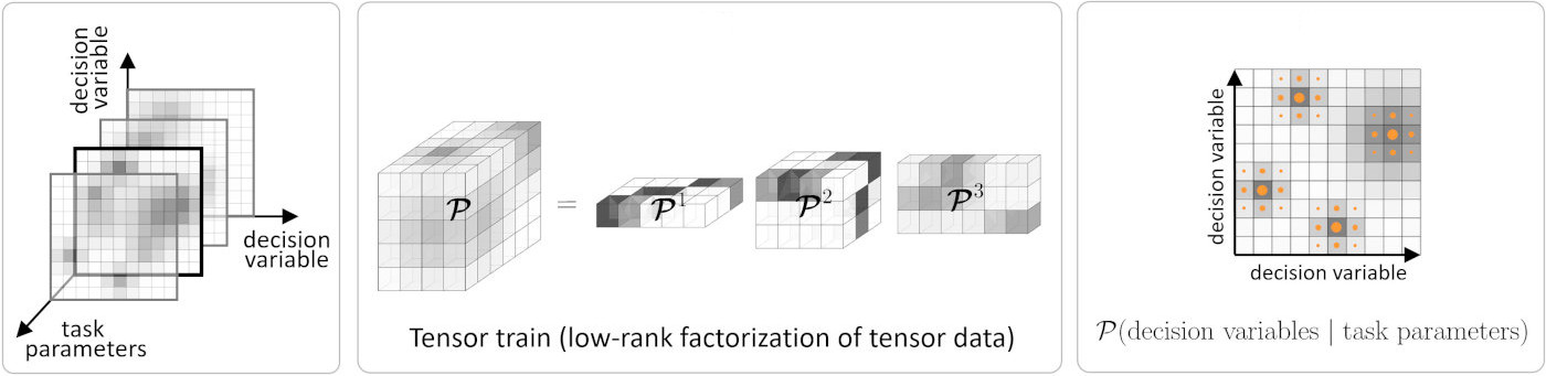 Learning and optimization problems in robotics are characterized by two types of variables: 1) task parameters representing the situation that the robot encounters, typically related to environment variables such as locations of objects, users or obstacles; and 2) decision variables related to actions that the robot takes, typically related to a controller acting within a given time window, or the use of basis functions to describe trajectories in control or state spaces. For each change of task parameters, decision variables need to be recomputed as fast as possible, so that the robot can fluently collaborate with users and can swiftly react to changes in its environment. In TTGO, the density function is modeled in the offline phase using a tensor train (TT) that learns the structure between the task parameters and the decision variables. It then allows conditional sampling over the task parameters with priority for higher-density regions. This property is used for fast online decision-making, with local Gauss-Newton optimization to refine the results, see the above figure for an overview. TTGO allows the distribution of computation into offline and online phases. It can cope with a mix of continuous and discrete variables for optimization thus providing an alternative to mixed-integer programming.