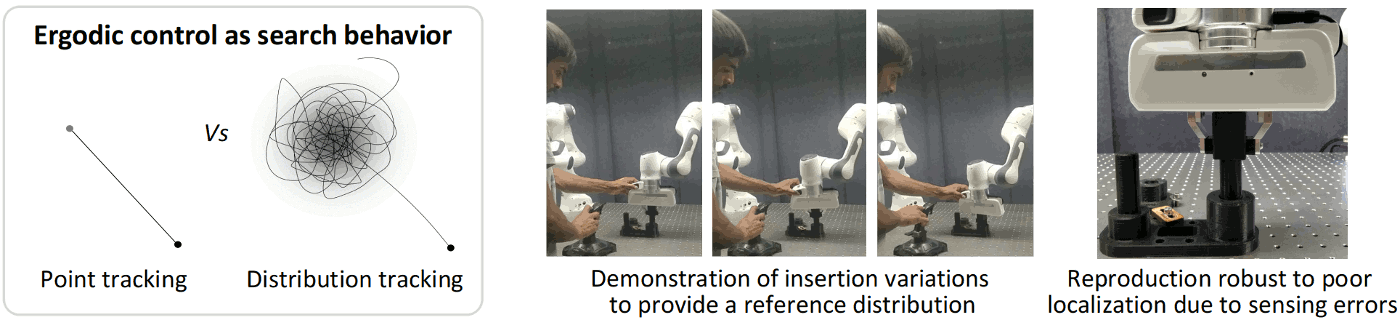 In robotics, ergodic control can be exploited in a wide range of problems requiring the automatic exploration of regions of interest. This is particularly helpful when the available sensing information is not accurate enough to fulfill the task with a standard controller, but where this information can still guide the robot towards promising areas. In a collaborative task, it can also be used when the operator's input is not accurate enough to fully reproduce the task, which then requires the robot to explore around the requested input (e.g., a point of interest selected by the operator). For picking and insertion problems, ergodic control can be applied to move around the picking/insertion point, thereby facilitating the prehension/insertion. It can also be employed for active sensing and localization (either detected autonomously, or with help by the operator). Here, the robot can plan movements based on the current information density, and can recompute the commands when new measurements are available (i.e., updating the spatial distribution used as target).