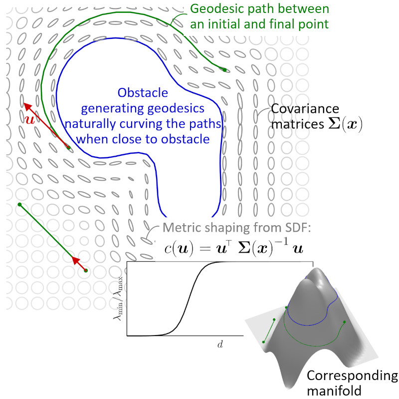 Several approaches exist to build these geodesic paths, which will be investigated in this project for the case of 3D motion to move between two pairs of points while avoiding an obstacle (blue paths on the image). The obstacle will be modeled as a distance field, with the Riemannian metric built from this distance field (ellipses on the image).