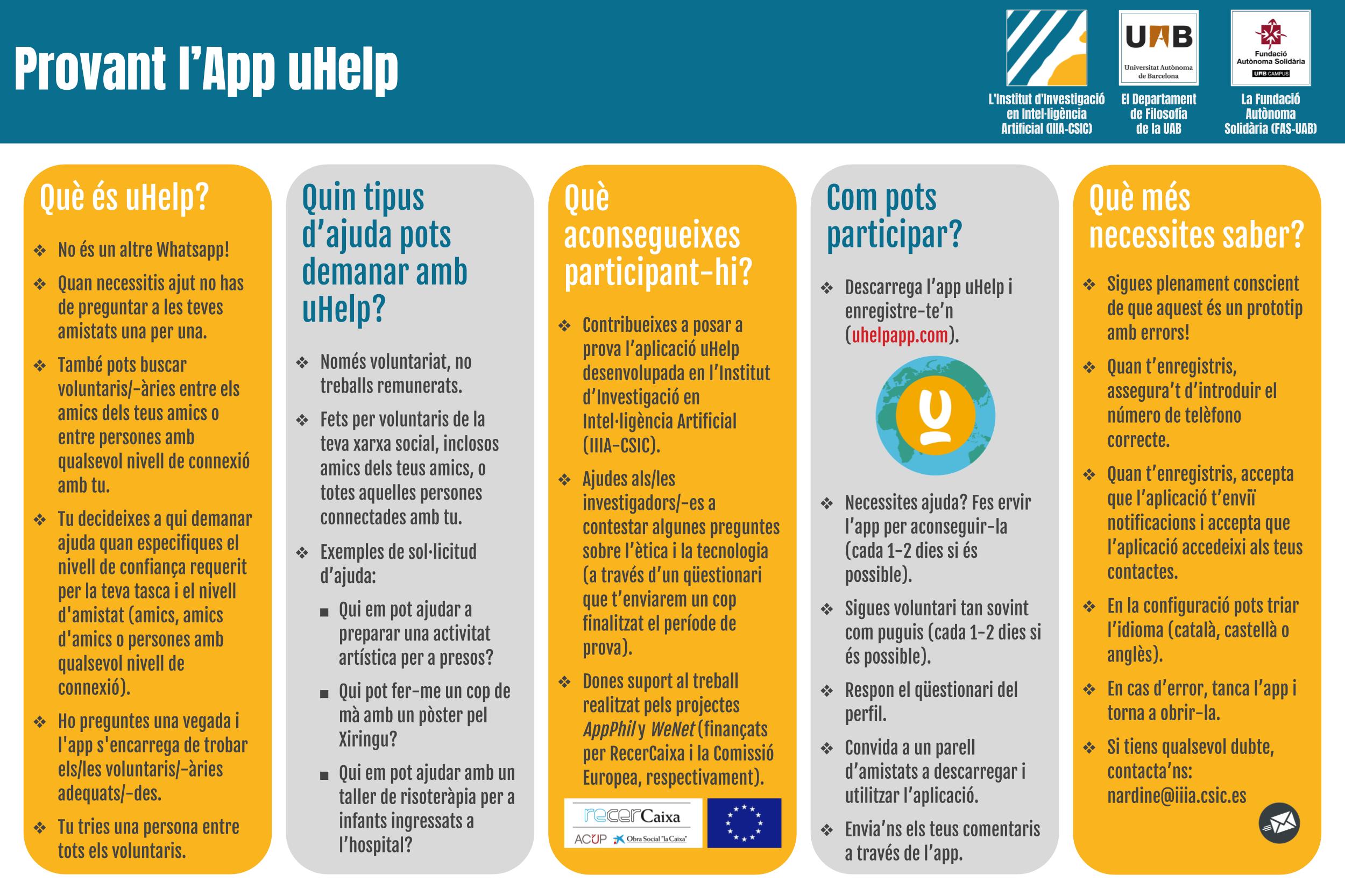 L’Institut d’Investigació en Intelligència Artificial (IIIA-CSIC), a WeNet partner, alongside the Department of Philosopy of the Universitat Autònoma de Barcelona (UAB) and the Fundació Autònoma Solidària (FAS) launched a new app, uHelp.
