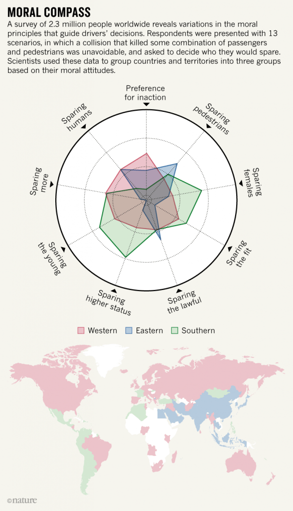 For example, for many Eastern cultures the role of the elderly in the social structure is much more important than in the West, and therefore this group was – in the experiments – “saved” more often. Similarly, in Central America, South America and in former French colonies, there was the tendency to save women more often. The results of this study prompt therefore the following question: shall we codify algorithms with different ethical rules according to the different geographic markets, or design and apply a universal standard, which is a compromise of all the differences found in diverse cultures?