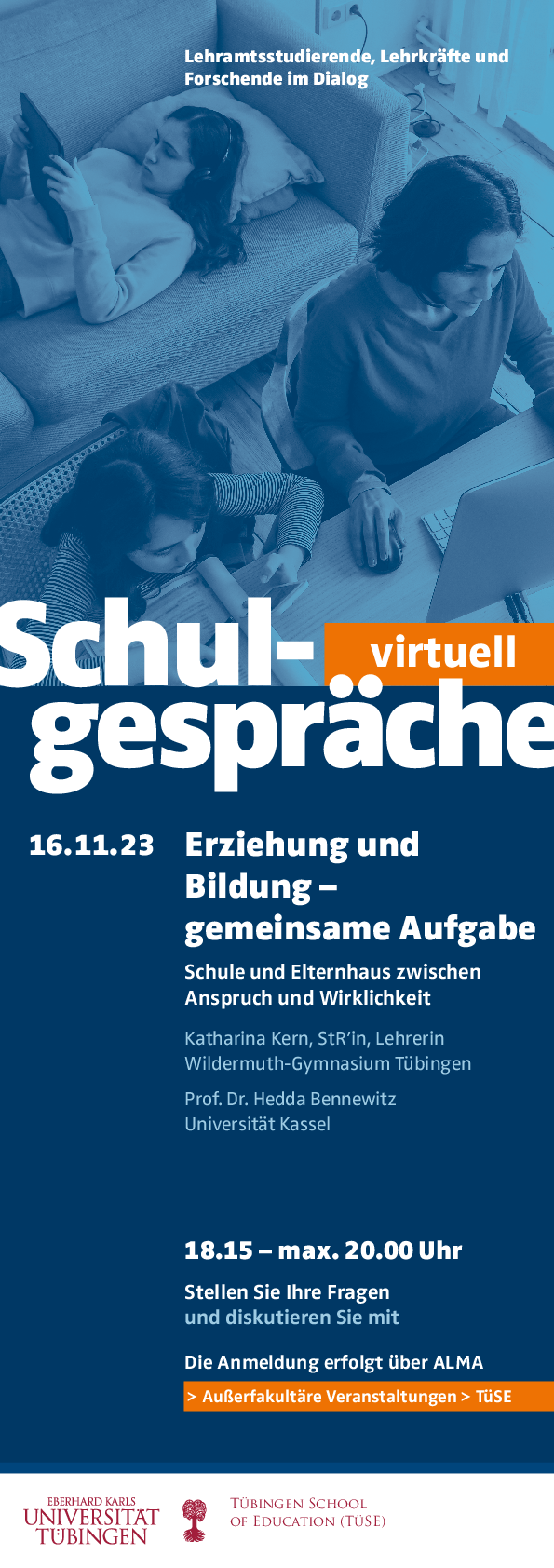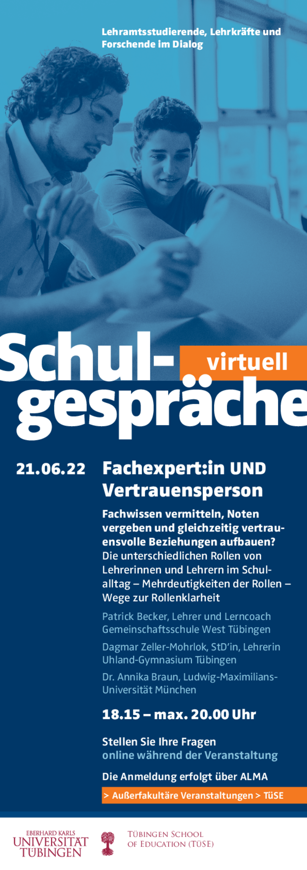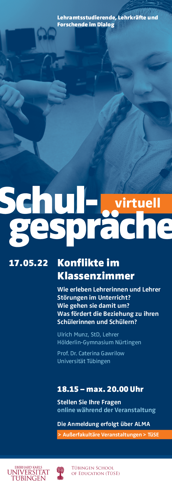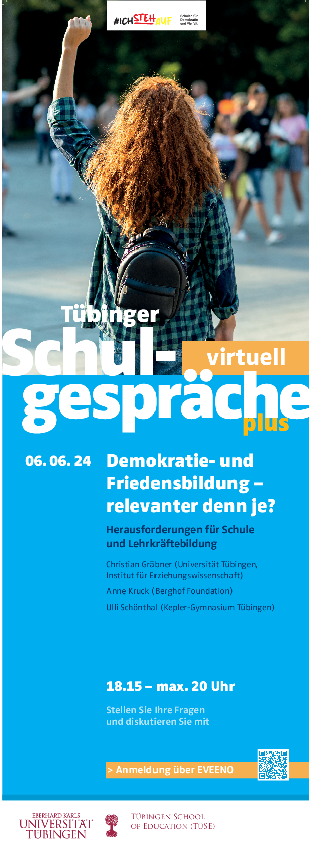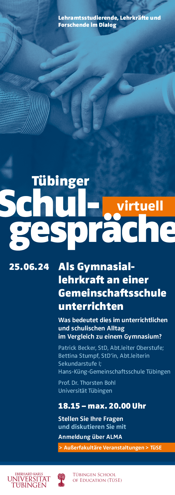 In Ergänzung zur Reihe Tübinger Schulgespräche thematisiert die Reihe Tübinger Schulgespräche plus besondere aktuelle gesellschaftliche Herausforderungen in der Schule und Lehrkräftebildung. Die verschiedenen Fragestellungen werden aus unterschiedlichen Perspektiven beleuchtet (schulischer Praxis, Wissenschaft, Beratungspraxis und/oder außerschulischer Bildung) und gemeinsam mit dem Publikum diskutiert. Unser Anliegen ist es, einen mehrperspektivischen Austausch auf Augenhöhe anzuregen und zu fördern.