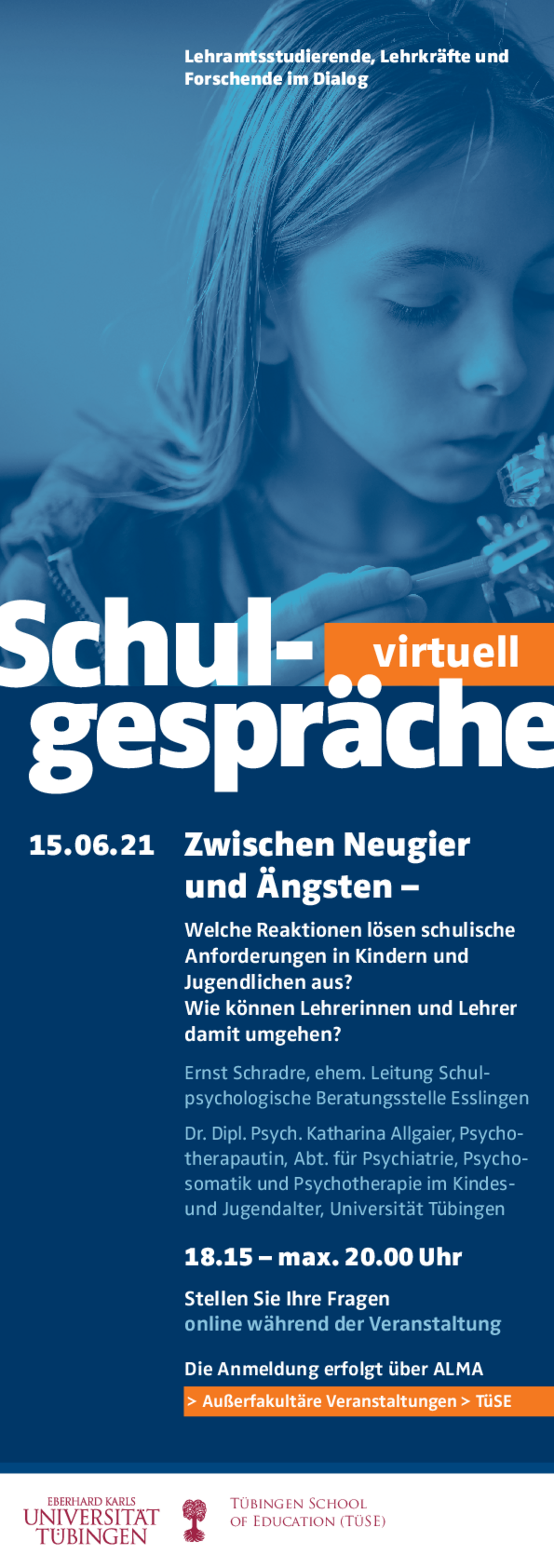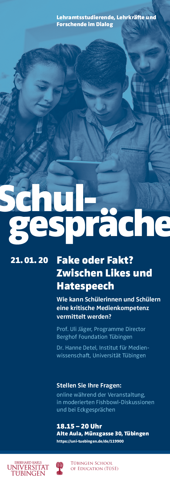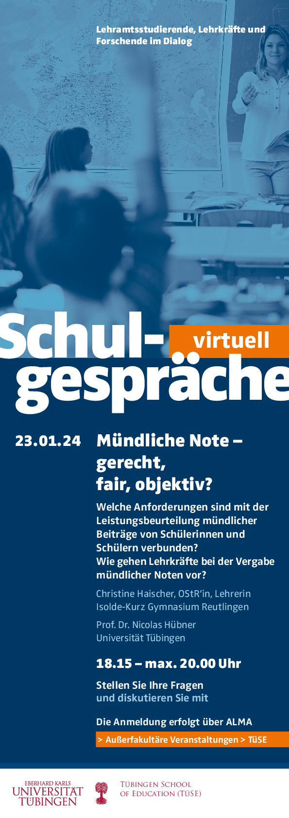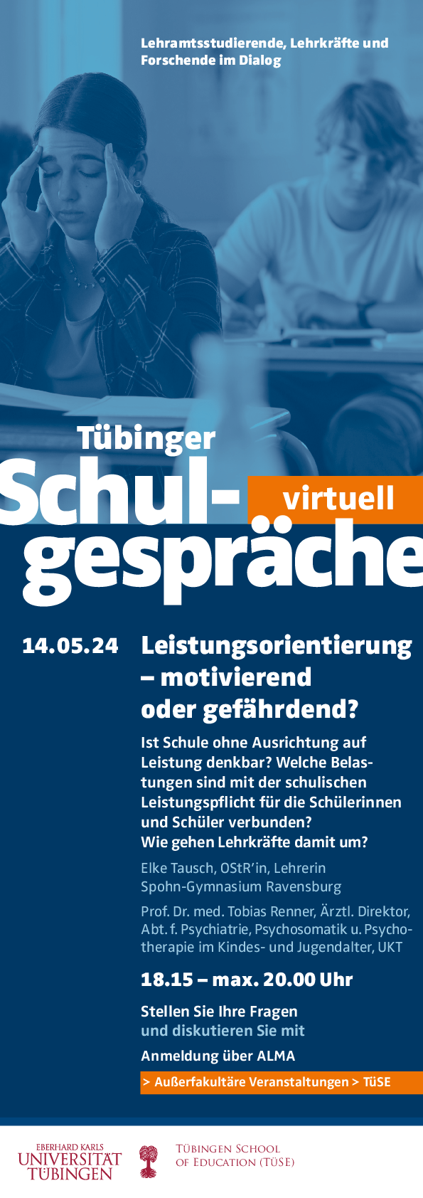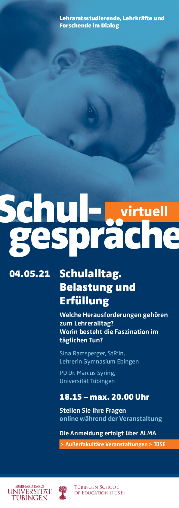 In Ergänzung zur Reihe Tübinger Schulgespräche thematisiert die Reihe Tübinger Schulgespräche plus besondere aktuelle gesellschaftliche Herausforderungen in der Schule und Lehrkräftebildung. Die verschiedenen Fragestellungen werden aus unterschiedlichen Perspektiven beleuchtet (schulischer Praxis, Wissenschaft, Beratungspraxis und/oder außerschulischer Bildung) und gemeinsam mit dem Publikum diskutiert. Unser Anliegen ist es, einen mehrperspektivischen Austausch auf Augenhöhe anzuregen und zu fördern.