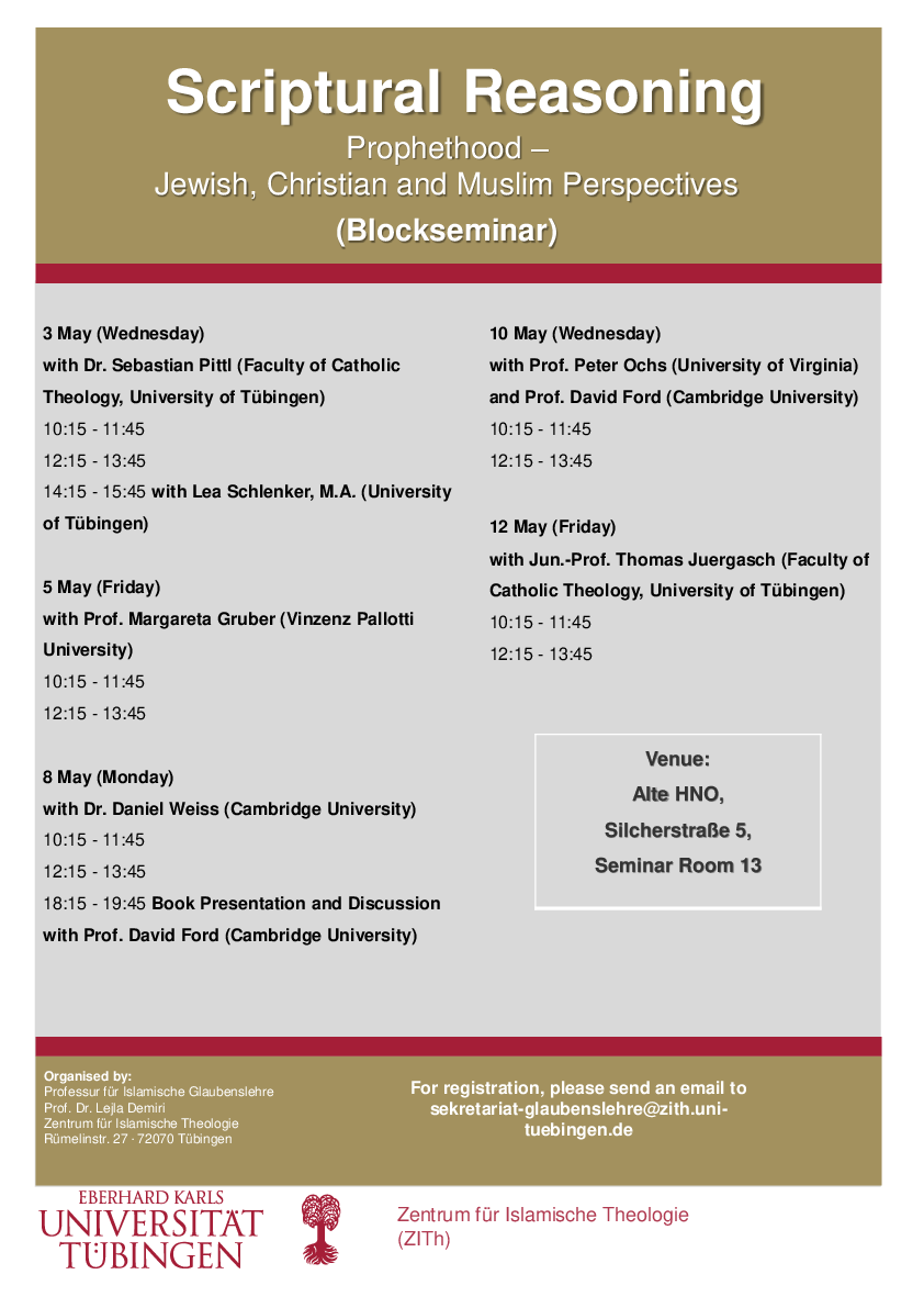 Im Sommersemester 2023 findet das Scriptural Reasoning Blockseminar zum Thema "Prophethood - Jewish, Christian and Muslim Perspectives" statt. Alle weiteren Informationen finden Sie auf dem Poster und hier.