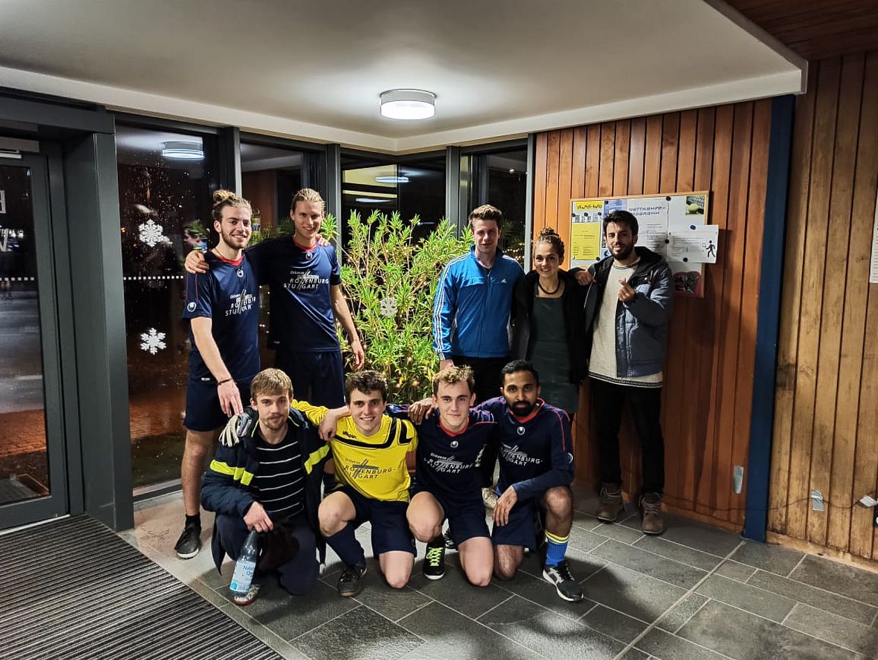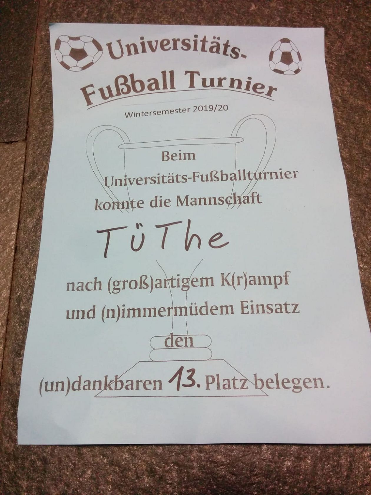 Drei Topgegner warten heute auf die Nationalmannschaft der Theologen aus Tübingen. Das Team war wieder top besetzt - ein Viertel der Mannschaft gönnte sich heute zum Warmlaufen den Nikolauslauf (21,1km). Die erste Minute im ersten Spiel gegen Namibia Holstein begann mit Pech. 0:1. Danach drückte die TüThe den Gegner in die eigene Hälfte. Die nötige Präzision im Abschluss erinnerte an die TüThe vergangener Jahre. Endstand 0:1. Zweites Spiel - Neues Glück?! NEIN. Gegen SK Lation war das Spiel lange offen, doch man verlor unglücklich mit 0:2. Zwei Spiele und 0 Punkte - Kehrt das übliche TüThe-Pech wieder ein?! Möglich. Im letzten Spiel am heutigen Tag ging es gegen den Erzrivalen und Vorjahressieger FC Saufhampton. Da war noch eine Rechnung aus dem Viertelfinale im letzten Jahr offen. Die TüThe tut was sie kann und wirft den Betonmischer an. Ein Pfostenschuss für FCS fand statt. Der Pfosten und die TüThebank zittert. Es bleibt vorerst beim 0:0. In der drittletzten Minute dribbelt die Nummer 10 vom FCS in der eigenen Hälfte. Ruben denkt sich: “Gönn ich mir!“, schnappt sich die Kugel und Kuddelmuddel. Man munkelt jemand hätte vielleicht gegrätscht. Doch der Videoschiri schläft im Kölner Keller. Der Ball landet bei Joji und er schiebt diesen gekonnt in die Maschen. 1:0 für die TüThe. 2min noch auf der Uhr. Der FCS startet wütend nach vorne. Nichts passiert. Letzte Minute. Kann die TüThe den Sieg gegen den Vorjahreschampion mit nach Hause bringen? Antwort gleich. Zuerst fliegt der Ball in Richtung TüThe-Tor. Der Pfosten wackelt und spielt für die TüThe. #Pfostenisteinervonuns. Das Netz wackelt nicht und der Schiri pfeift ab. 1:0 gegen FC Saufhampton gewonnen und den Spieltag versöhnlich abgeschlossen. Die TüThe bedankt sich ihren Fans, verabschiedet sich in die Winterpause und wünscht allen eine gesegnete Adventszeit!