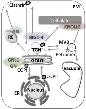 | Figure 1 Membrane trafficking pathways in Arabidopsis Key regulators (ARF-GEFs GN, GNL1, BIG1-4) and coat proteins (COPI, COPII, clathrin, retromer) are indicated. ER, endoplasmic reticulum; MVB, multivesicular body; PM, plasma membrane; RE, recycling endosome; TGN, trans-Golgi network. | |