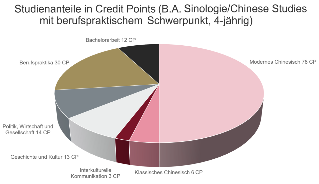 Der Zugang zu einem der Berufsfelder kann durch die Nebenfachwahl bestimmt werden, aber auch durch individuelles Interesse und selbstständiges Engagement zum Beispiel mittels Praktika. Nutzen Sie Ihren Chinaaufenthalt im B.A.-Studium, um vor Ort Kontakte zu knüpfen. Insbesondere unser 4-jähriger B.A.-Studiengang ist als Sprungbrett ins Berufsleben angelegt, sei es auf dem chinesischen Arbeitsmarkt, sei es auf dem China-orientierten Arbeitsmarkt hierzulande.