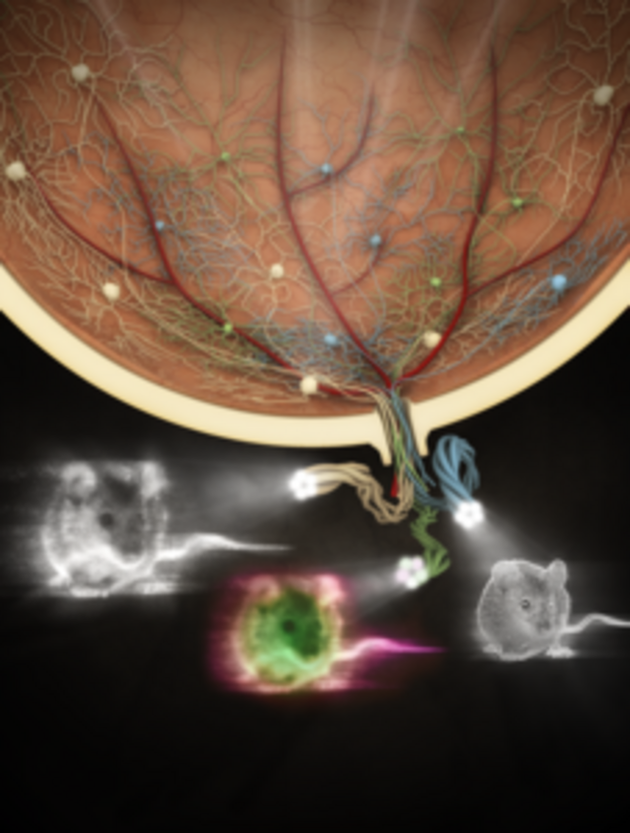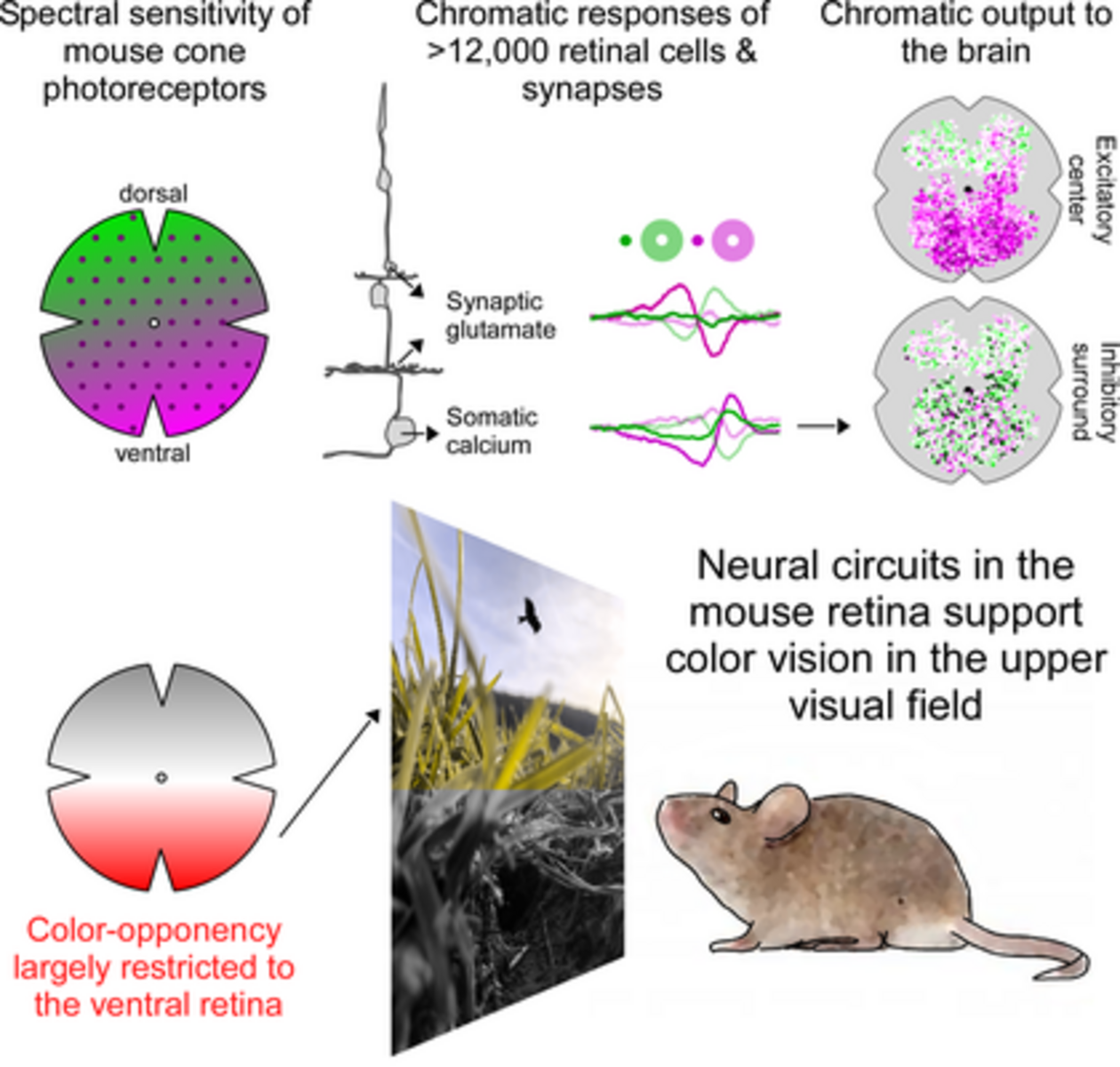 For example, we have recently investigated how color – a distinct visual feature – arises within the retinal network by recording light responses to colored stimuli all the way from photoreceptors to the retinal output. This revealed that neural circuits in the mouse retina are exquisitely tuned to extract color information from the upper visual field (Szatko, Korympidou et al. 2019), where it might aid robust detection of aerial predators and ensure the animal´s survival. Interestingly, our findings may explain recent behavioral data (Denman et al. 2018), demonstrating that mice are better at discriminating light spots of different colors in the upper compared to the lower visual field.