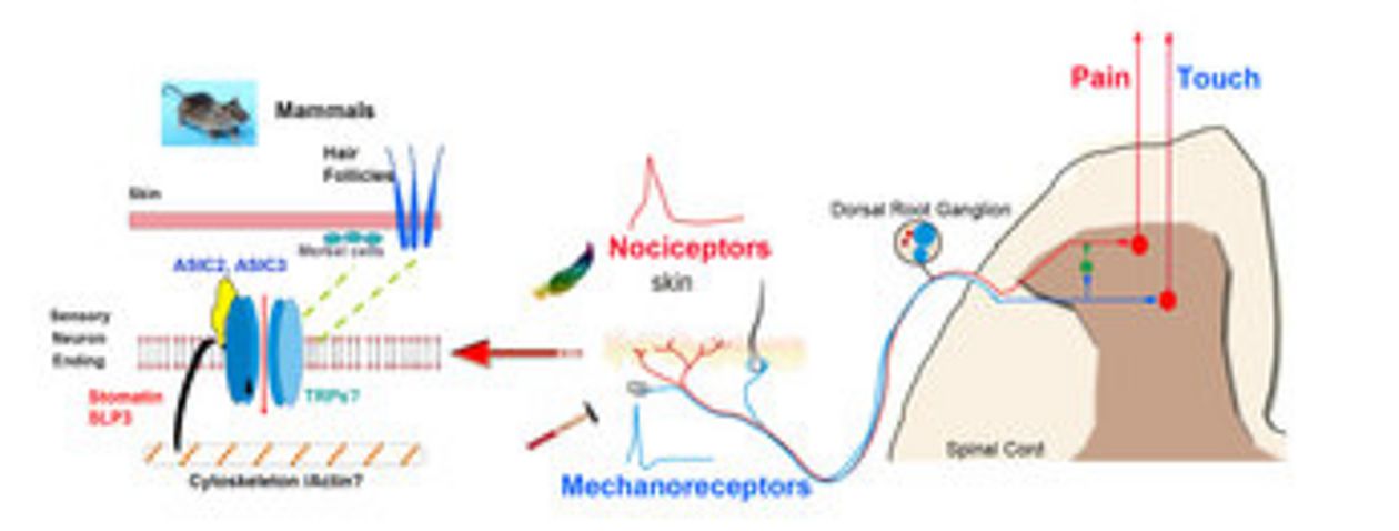 The light-transducing molecule rhodopsin has been known for 130 years and olfactory receptors were discovered 18 years ago, but the molecules that convert physical forces to electrical signal in mammals still remain unknown. Our research focuses on elucidating the transduction mechanism in mammals and identifying the transduction components based on C.elegans mec genes found in a genetic screen for touch insensitive mutants. One particular interest in the future is to explore how these transduction components are altered during neuropathic or chronic pain.