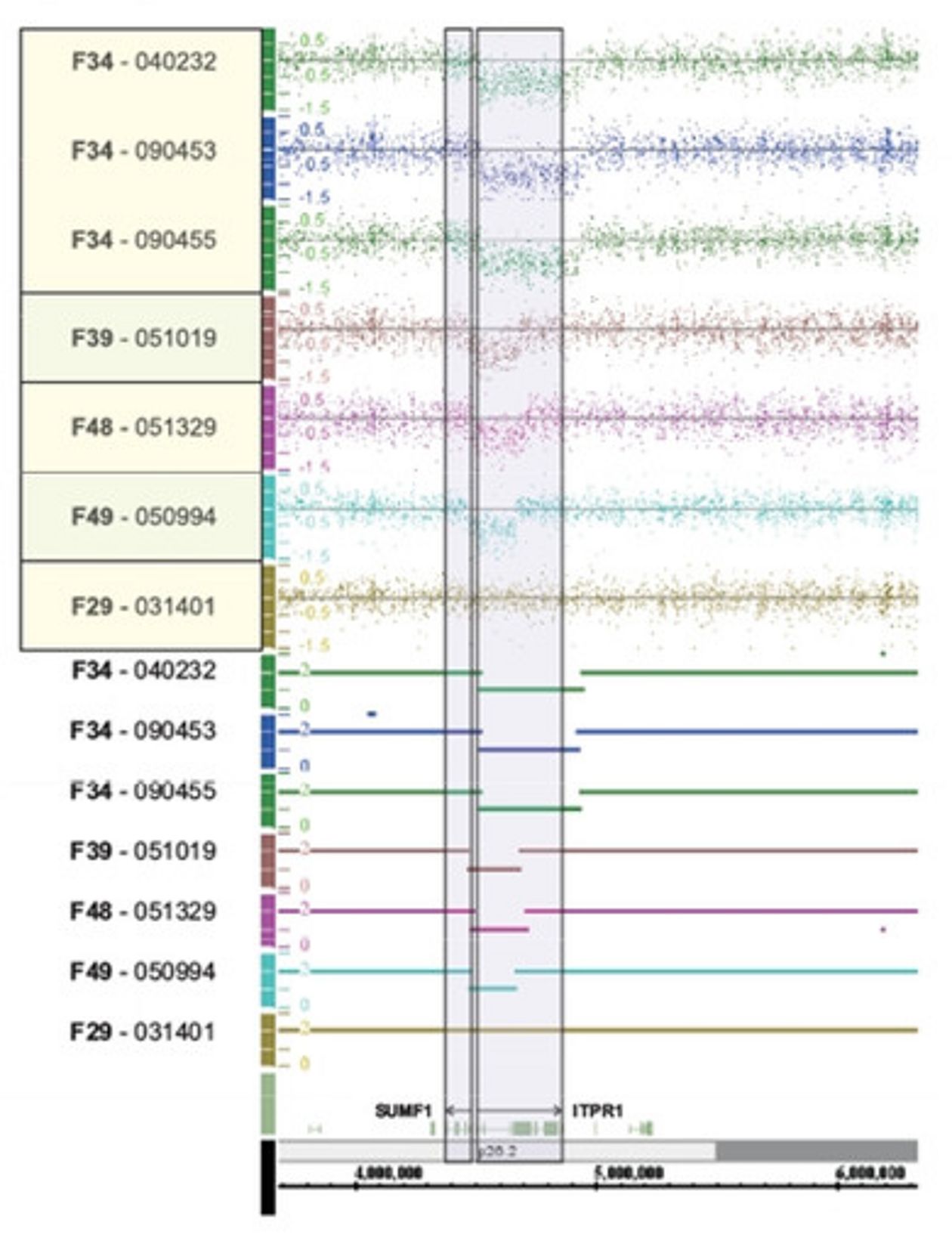 Alternatively, tiling arrays may be used to screen for macrodeletions. In this case templates of genomic DNA are hybridized to the array and the intensity of the signal indicates copy numbers of the respective DNA fragment (comparative genomic hybridization – CGH).