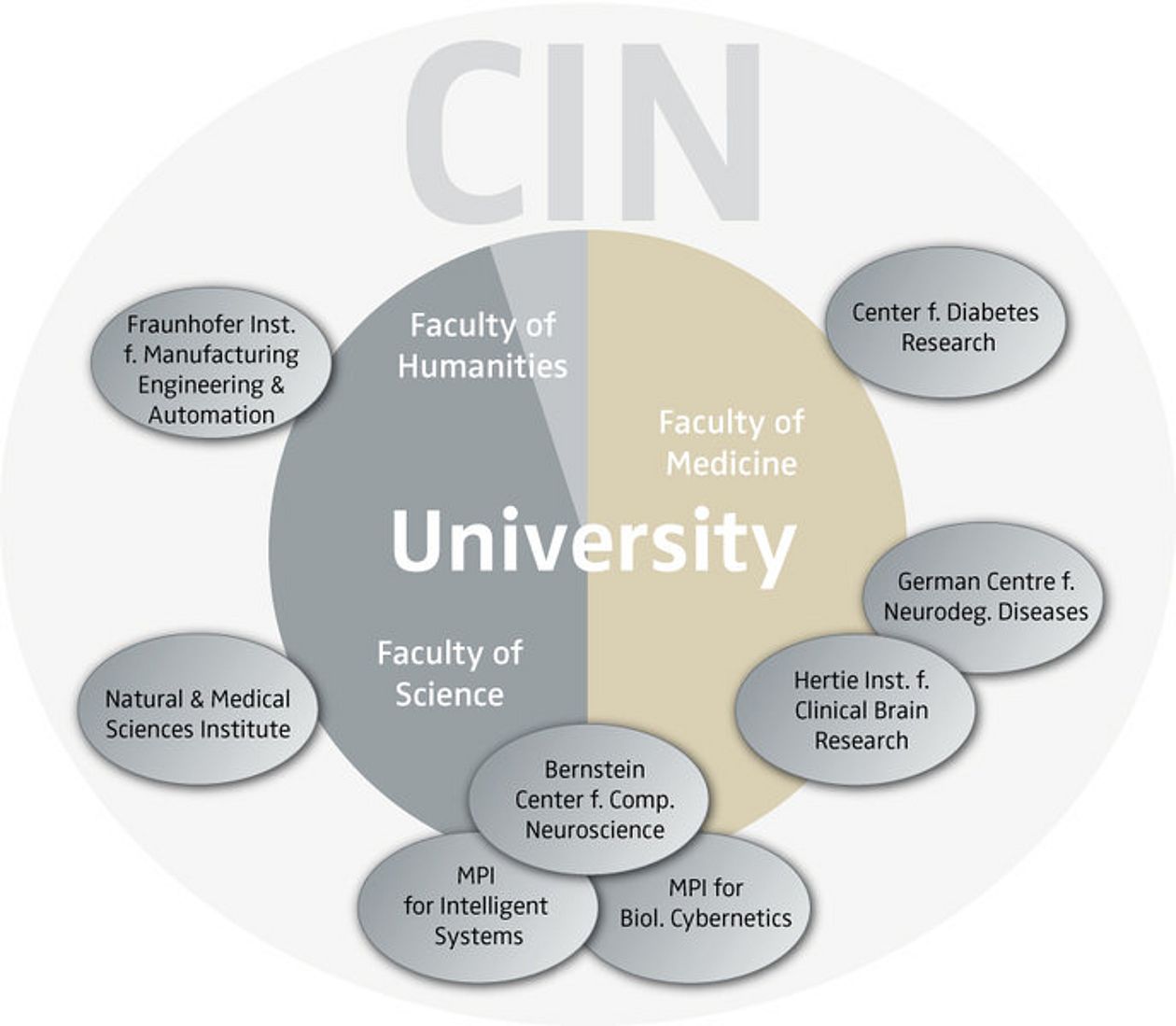 The CIN is supported by three faculties of the university (the Faculties of Science, Medicine, and Humanities), as well as numerous institutes situated in and around Tübingen, with partnerships including the Max Planck, Hertie, Helmholtz, Bernstein, and Fraunhofer communities. Internationally, the CIN cooperates with prestigious institutions in Japan, Israel, and the United States.