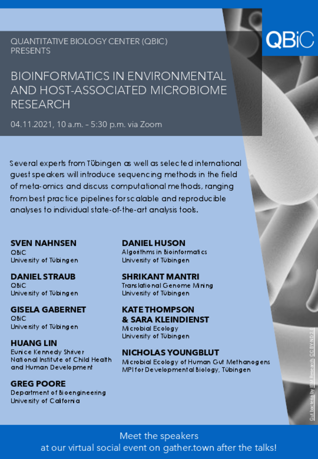 The Workshop will comprise lectures in the field of microbiome research, covering both environmental and host-associated applications. Several experts from Tübingen as well as selected international guest speakers will share their research at various fronts in the field of microbiome research.