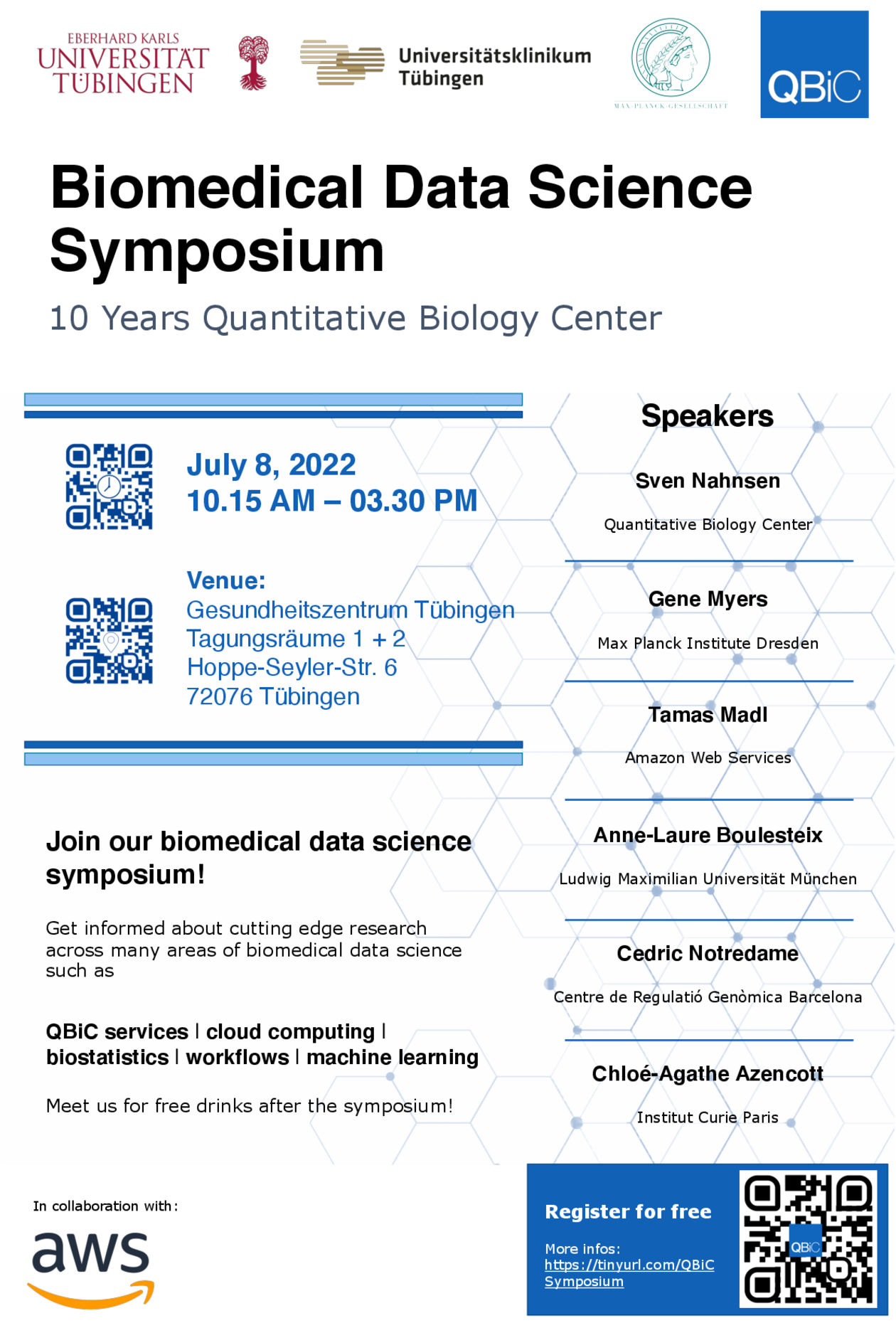 Join us for this exciting day of biomedical data science to celebrating QBiC’s 10 year anniversary. The event will showcase cutting edge research across many areas of biomedical data science, and provides an opportunity to get informed about the Quantitative Biology Center (QBiC), its achievements, as well as the vision for the future. The event targets the broad life science community to come together to discuss science and the center’s service portfolio.