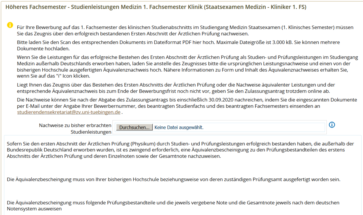 Wenn Sie Leistungsnachweise für die Bewerbung in das höhere Fachsemester nachreichen müssen, sind Sie an die Nachreichefrist für höhere Fachsemester gebunden (https://uni-tuebingen.de/de/2053). Innerhalb dieser Frist können Sie Ihre Leistungen als Scan per E-Mail an studierendensekretariatspam prevention@zv.uni-tuebingen.de unter Angabe Ihrer Bewerbernummer, Ihres beantragten Studienfachs und des beantragten Fachsemesters nachreichen.