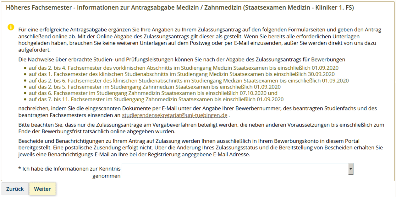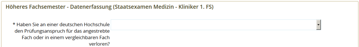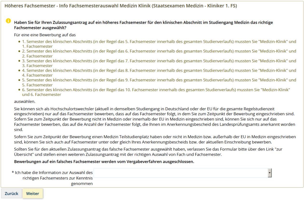 Wenn Sie gerade das Physikum bestanden haben (oder es in Kürze bestehen, sodass Sie das Physikumszeugnis noch während der Nachreichefrist bei uns einreichen können), ist in der Regel eine Bewerbung in das 1. klinische Fachsemester die richtige Wahl. Das 5. klinische Fachsemester wäre hier falsch und wäre vom Verfahren ausgeschlossen! Bitte beachten Sie dies bereits bei der Auswahl: