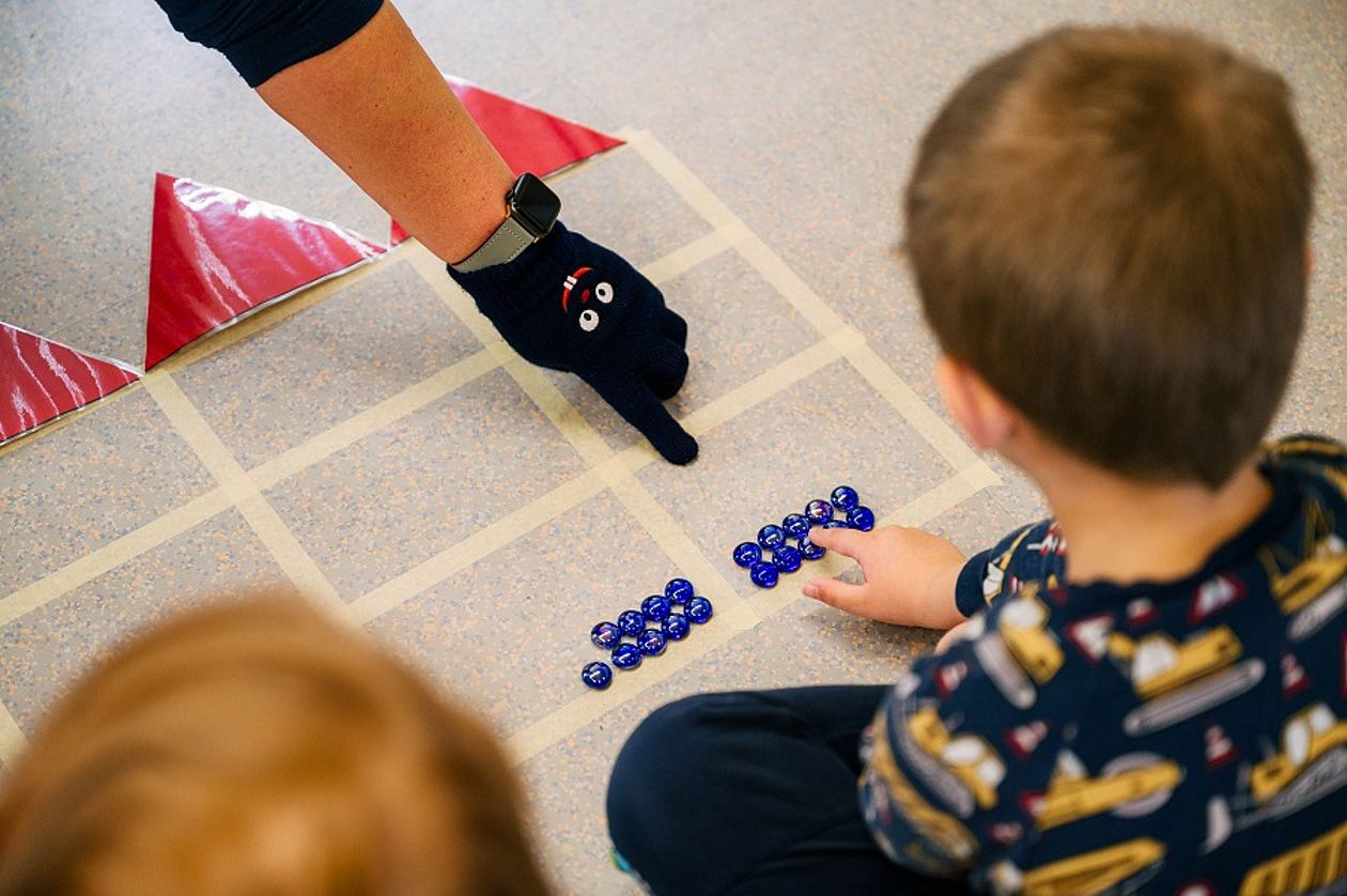 The fun starts when Kullen opens a small treasure chest with ten glass stones inside. The kids play against Ed and Ted by rolling some dice for the stones. The aim of the game is to win as many glass stones as they can. Karl, a blond boy sitting at the low table to the left of the teacher, rolls the dice: Four and three. “Seven!” he calls, showing four fingers on his left hand and three on his right. He’s almost right. Ed and Ted’s fingers are positioned slightly differently. Kullen explains: “If you take five fingers on the left hand and two on the right hand, you will see the seven much more clearly.” But that’s a moot point. The children have won the round and receive seven stones from the treasure chest. How many are left? As the children concentrate, they stretch and bend their little fingers. Anastasia is the first to call out the result: “Three!”