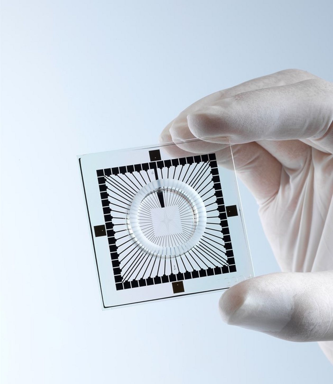 Human cardiac muscle cells pulse rhythmically under the microscope. They are arranged like a mini 3D heart on a chip, known as a microelectrode array (MEA). Every few seconds, the heart muscle cells contract and relax again. All at the same time. Rhythmically. Tiny electrodes measure the voltage discharged by the cells.