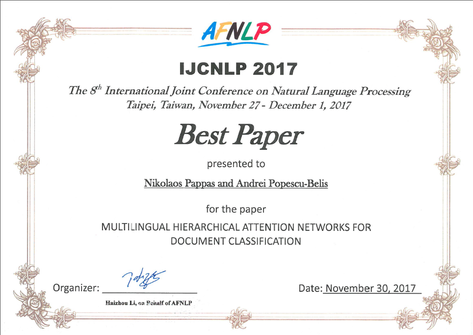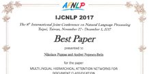 Idiap Researchers Nikolaos Pappas and Andrei Popescu-Belis awarded at the IJCNLP 2017